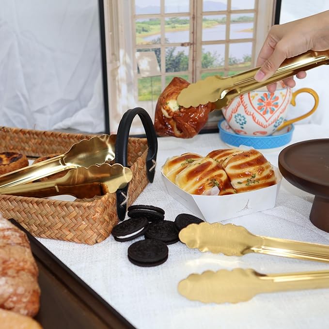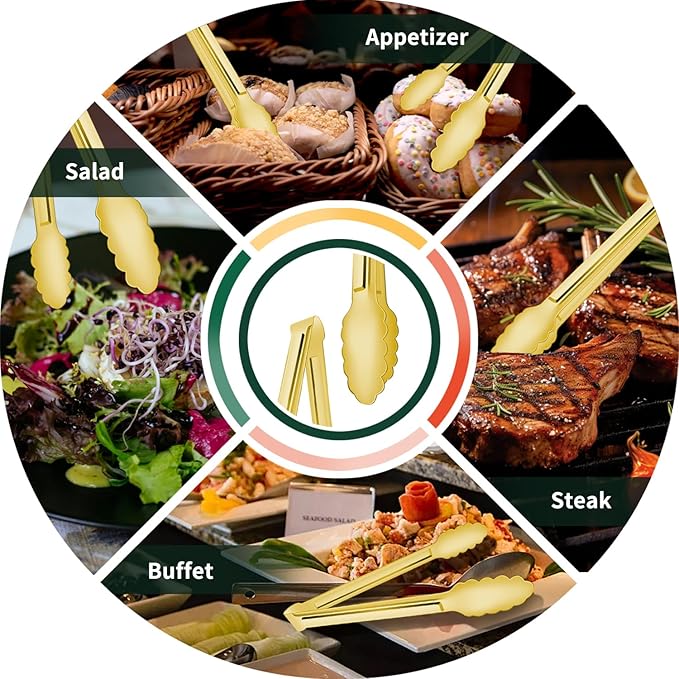 - charcuterie boards and various toppings like lettuce, onions, tomatoes, and pickles. Durable and Reusable Tongs: With a length of 9 inches, these gold - plated stainless steel tongs are suitable for serving a wide range of dishes, including salads, steaks, and desserts. They are perfect for both entertaining guests and everyday use, making them an essential addition to your kitchen.