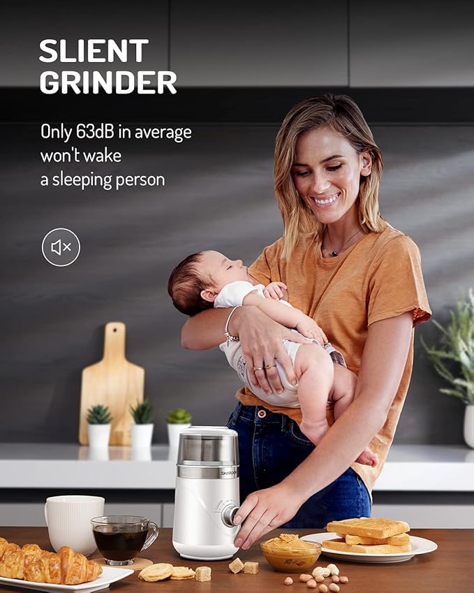 - 【Quiet Coffee Grinder】Enjoy the peace and quiet of your morning routine with this exceptionally quiet coffee grinder (63dB). Wake up and grind your beans without disturbing your family's sleep.