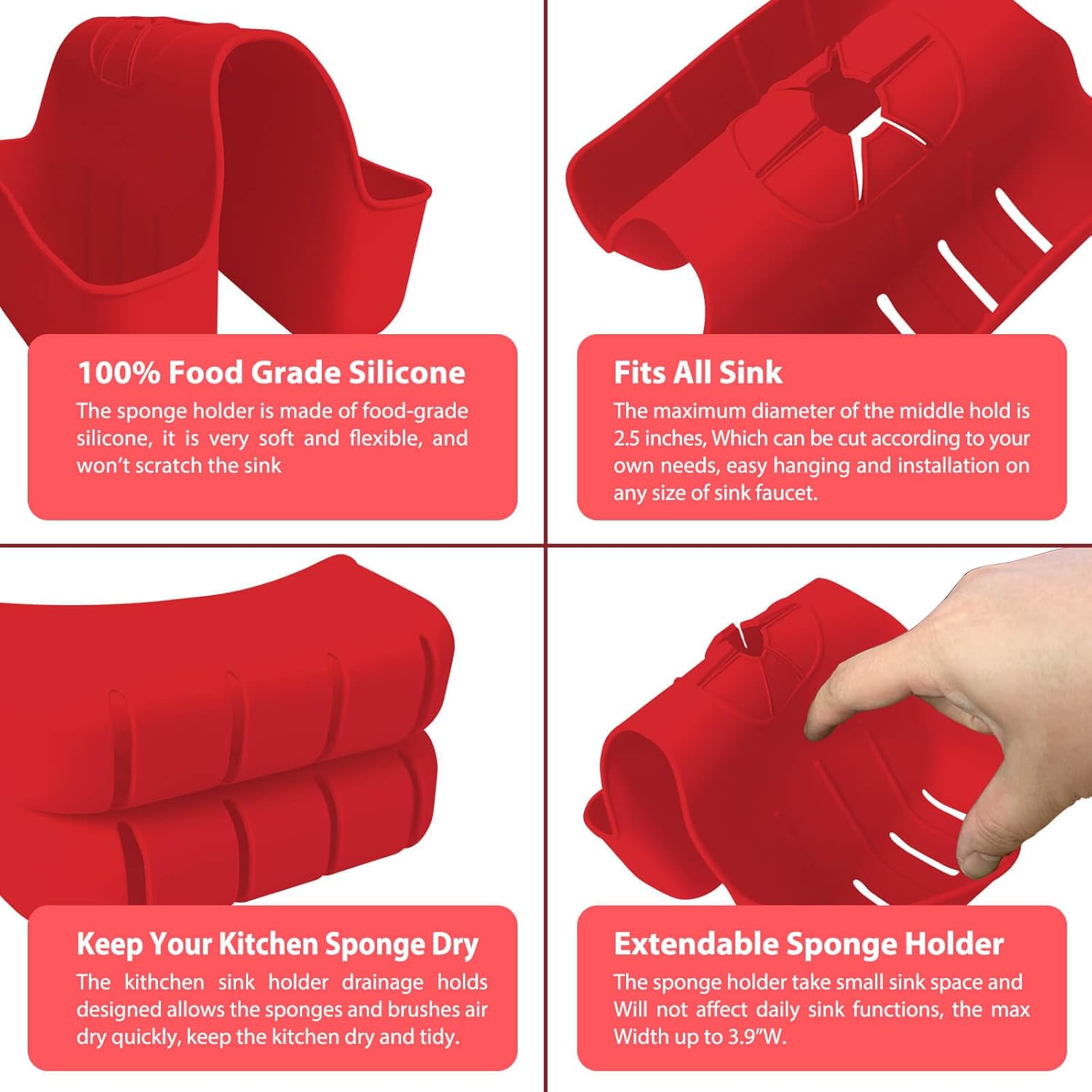 Sponge Holder for Kitchen Sink, Silicone Sink Saddle Caddy Organizer Rack, Sponges Holder Over Faucet, Hanging Kitchen Organizer Accessories Rack Basket Red