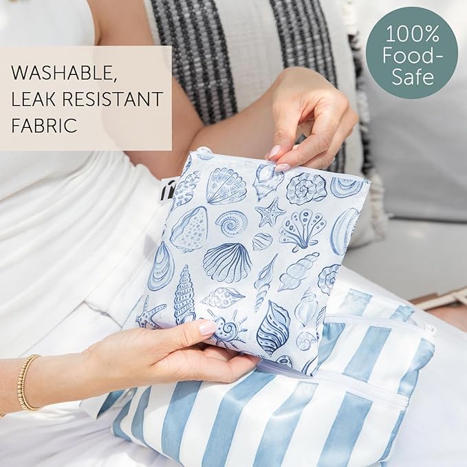 Roamio Reusable Sandwich and Snack Bags, for Kids School Lunch and for Adults Portion, Washable Fabric, Waterproof Cloth Zip Bag, Travel Pouch, Food-Safe, 4-pack Set Nautical Stripe and Blue Shells