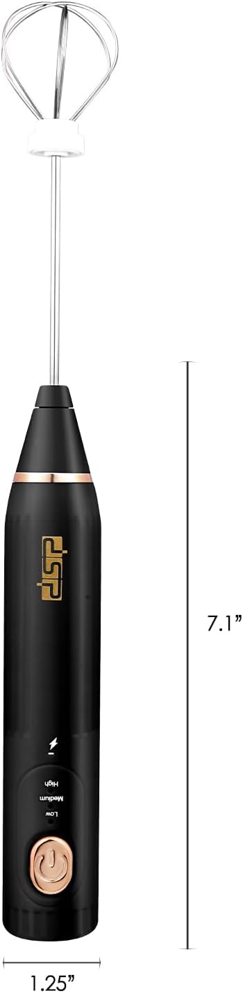 - 【Rechargeable 3-Speed Frother】DSP handheld milk frother features a Powerful battery with USB charging (DC5.5V). With 5800/8500/12000 RPM speeds, it creates café-quality foam for coffee, latte, or hot chocolate in 15 sec. Includes 2 stainless steel whisks for drinks & baking.