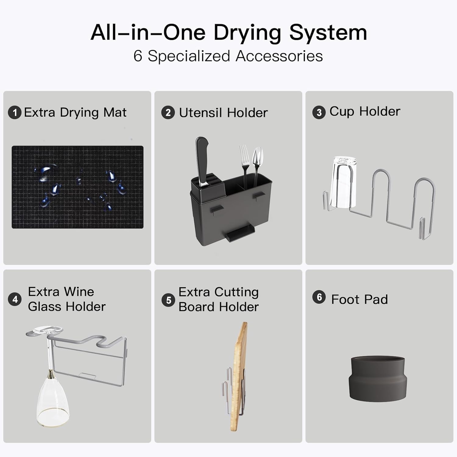- 🛠️ All-in-One Drying System: 7 specialized accessories: drying mat, utensil holder, drainboard set, wine glass holder, cup holders, cutting board slot, non-slip feet cover. Stores all dish types vertically or horizontally. Maximizes small kitchens