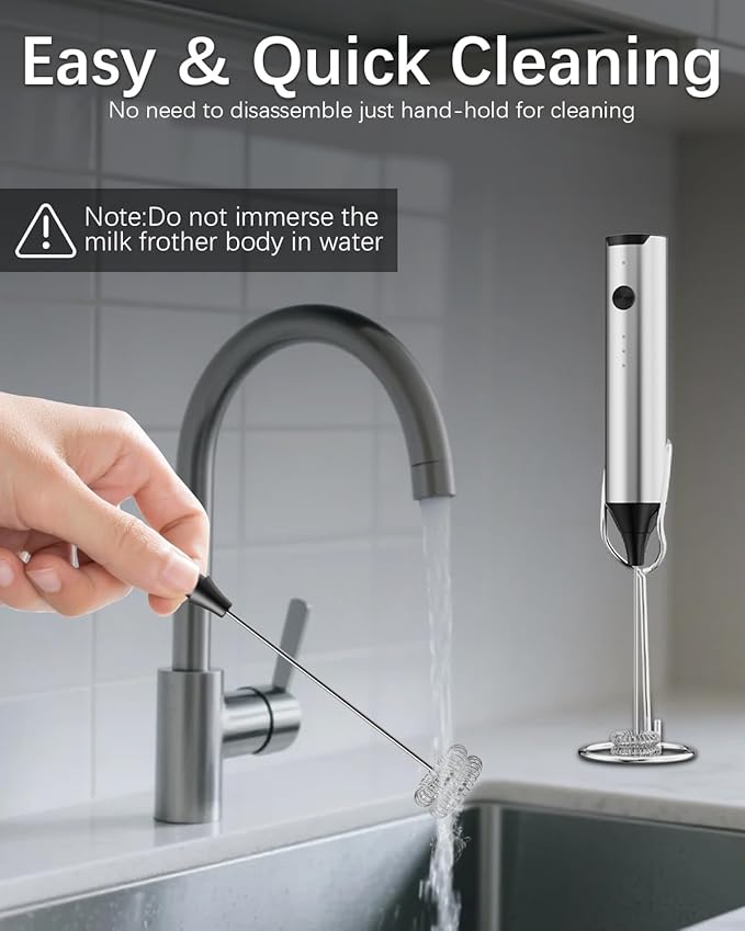 - Easy to Clean and Store: To clean this electric milk frother handheld with stand, simply place the whisk under water and briefly turn it on to get rid of any residue.When not in use, our electric whisk can easily fit in your bag or in your kitchen drawer.Please note that the body of the coffee frother handheld is not waterproof, so do not immerse it in water.