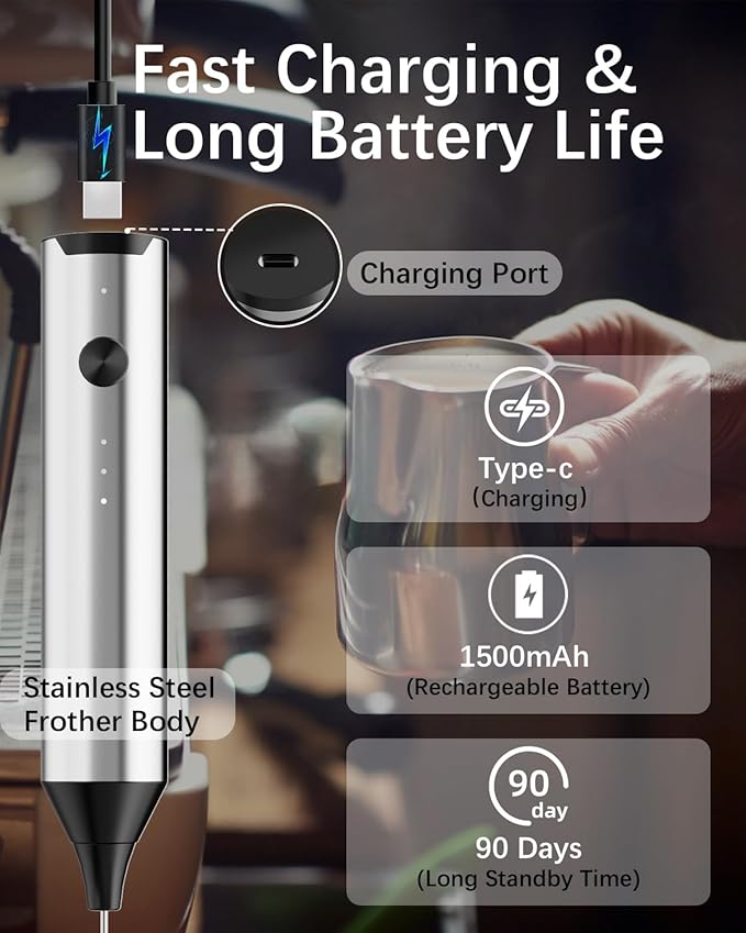 - 2 Stainless Steel Mixing Heads & 3 Settings: The handheld milk frother with a silver stainless steel body includes 2 detachable 304 stainless steel mixing heads, which can be easily switched to suit various kitchen usage scenarios. Rechargeable milk frother has an integrated button on the hand blender main unit with low/medium/high settings that you can control to achieve your desired milk froth result. (Note: No matter which gear it is in, long press for about 1 second to completely close the milk frother.)