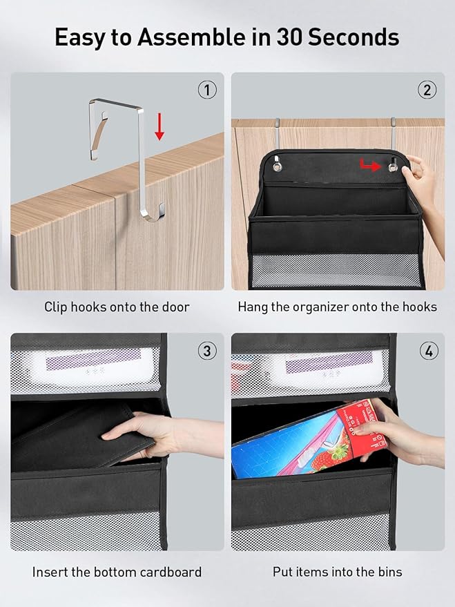 - Tool-free Assembly Within Seconds: No need to insert cardboard in the pockets as required by other bathroom storage shelves! We have it pre-inserted in the pockets to cut your hassle. Simply hang, put the cardboard in the bin's bottom, and done! Definitely a good pickup for anyone on a budget wanting to update organization and storage for extra storage