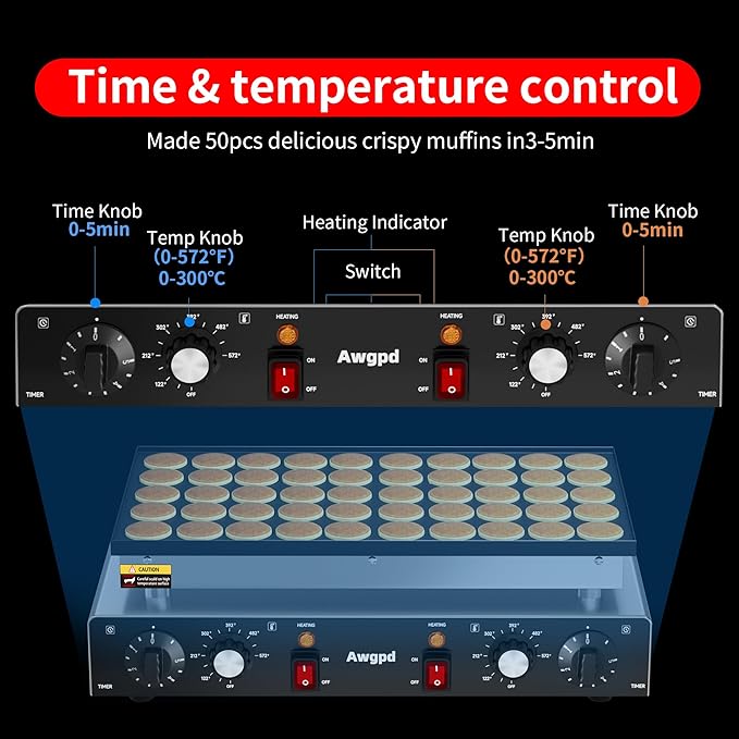 - Easy to operate: The muffin maker is designed with a user-friendly control panel that can be operated by even non-professional chefs. The operation panel is simple and clear. After preheating, just wait a few minutes to enjoy delicious mini pancakes. The operation console of the muffin machine includes timing and temperature control switches, heating indicator lights and power switches