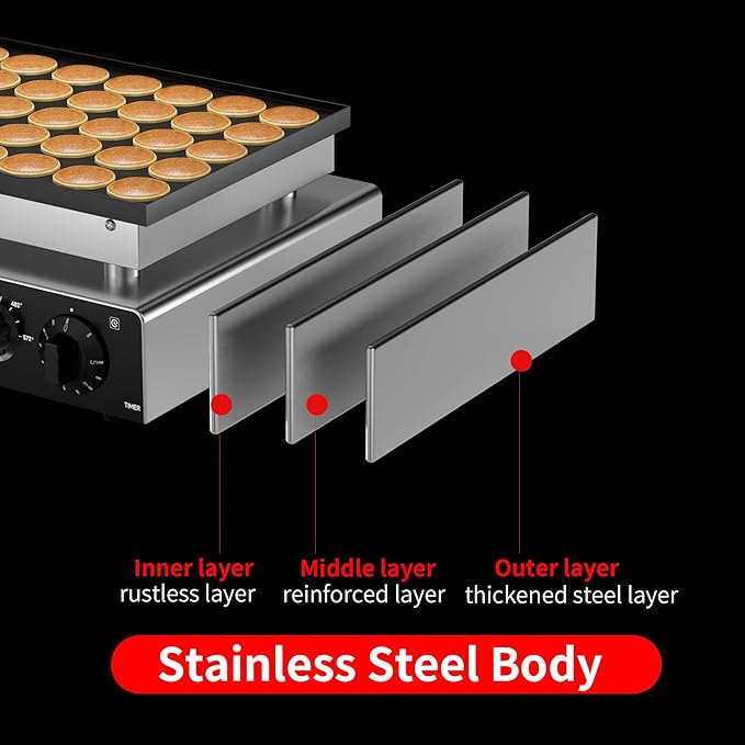 - Heavy-Duty Material:This commercial pancake maker adopts a high-quality food-grade stainless steel body and a non-stick cast-iron plate. Sanitary and durable. It's sturdy and long lasting, high temperature resistant, moisture-proof and rust-proof. The sturdy construction will also provide you with a more reliable and reassuring baking experience
