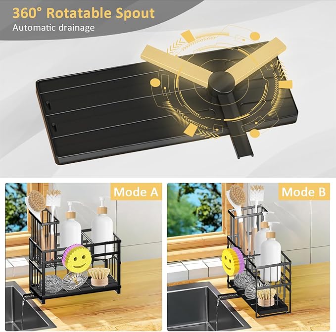 - 【Rotatable Spout】This kitchen sink caddy features a rotatable spout that swivels in three directions, ensuring that water from the sink sponge holder is directed straight to the sink. This design helps maintain a dry countertop, cutting down on the need to clean the drip tray frequently—ideal for enhancing your kitchen organization and saving your cleaning time.