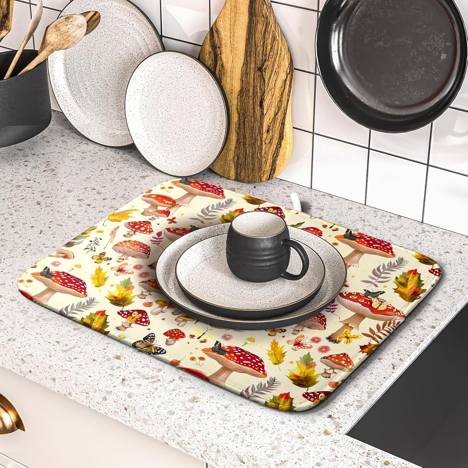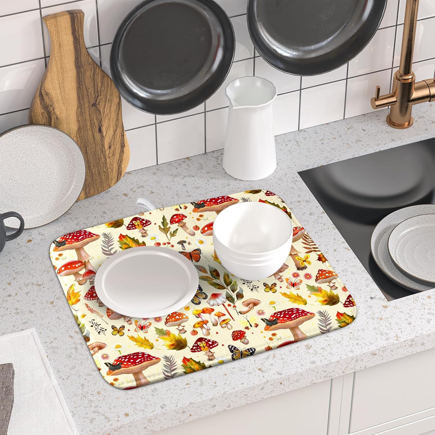 Forest Mushroom Dish Drying Mats Wild Plant Butterfly Kitchen Sink Rack Mats 16 X 18 Inch