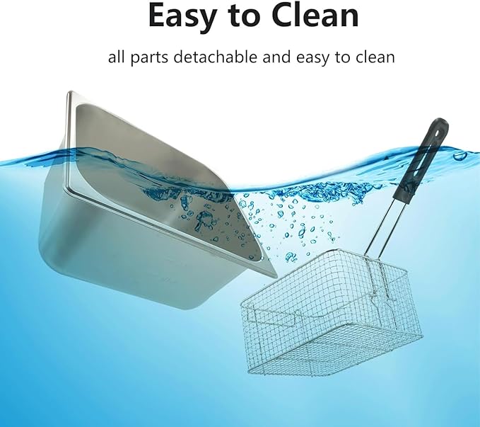 - 【Easy to Drain and Clean】After frying, the deep fryer basket can be hung on the fryer head to drain excess oil, keeping your food flavorful and reducing mess. Additionally, all parts except the fryer head are detachable and easy to clean, making maintenance a breeze.
