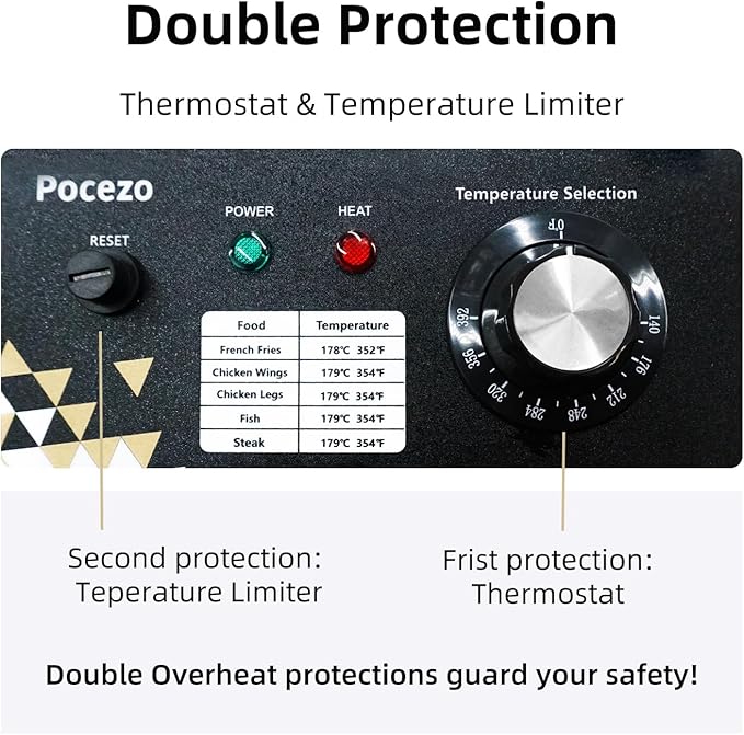 - 【Double Overheat Protection】Safety is at the core of this fryer. This model is updated from the regular model and equipped with double overheat protections (temperature limiter and thermostat). The thermostat automatically stops heating when the desired temperature is reached. Once the oil cools, it reheats to maintain optimal frying conditions. And the temperature limiter works when the thermostat fails. Besides, the fry basket features Anti-scalding handles and non-slip foot pads. The well-matched lid prevents hot oil splashes.
