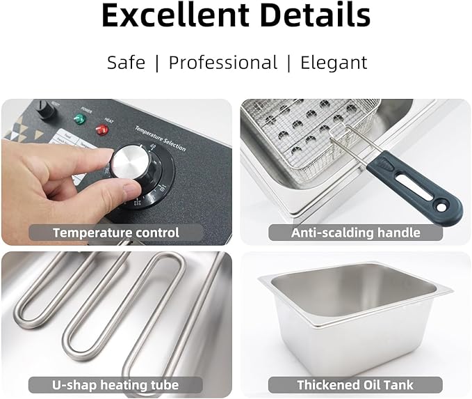 - 【Double Overheat Protection】Safety is at the core of this fryer. This model is updated from the regular model and equipped with double overheat protections (temperature limiter and thermostat). The thermostat automatically stops heating when the desired temperature is reached. Once the oil cools, it reheats to maintain optimal frying conditions. And the temperature limiter works when the thermostat fails. Besides, the fry basket features Anti-scalding handles and non-slip foot pads. The well-matched lid prevents hot oil splashes.
