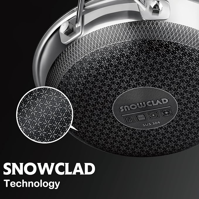 - [SNOWCLAD ENHANCED TECH]: Featuring a cutting-edge enhanced nonstick coating with a snowclad surface design, our non stick frying pans set offers longer-lasting, superior non-stick performance. No more worries about peeling or flaking—this set offers exceptional durability and is designed to withstand the use of metal utensils. Additionally, our clad surface is 50% larger than that of typical hex pans.
