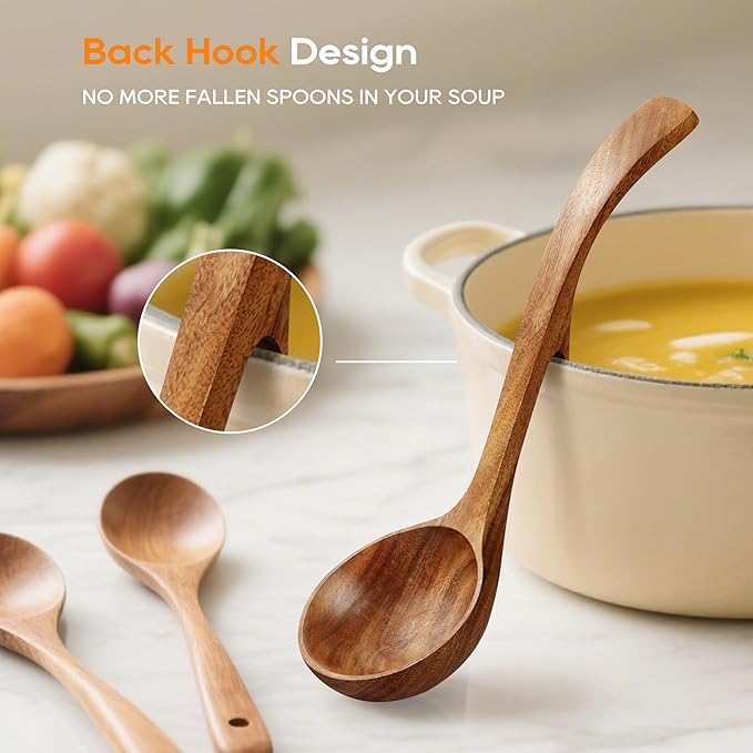 - Back Hook Design: In contrast with others, our wooden soup spoon is designed with a hook on the back, that you can easily catch on to the edge of the bowls or pot during cooking and after cooking, no more fallen spoons in your soup
