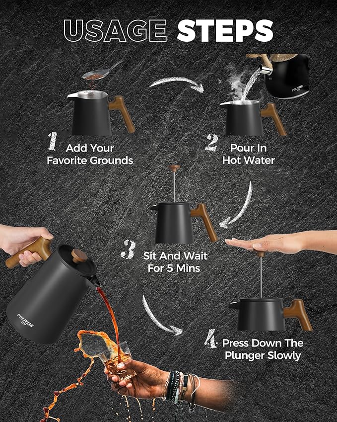 - LOOKING FOR COFFEE PRESS FOR MATCHING UP YOUR KITCHEN? We, the POLIVIAR french press coffee maker will be your smart choice. While the coffee pot is made from food grade stainless steel with stylish long-lasting coating, It is easily to match up your kitchenwares and your kitchen's theme. Also, the ergonomic handle with real wood will maximize the fantastic time of grounds you loved.