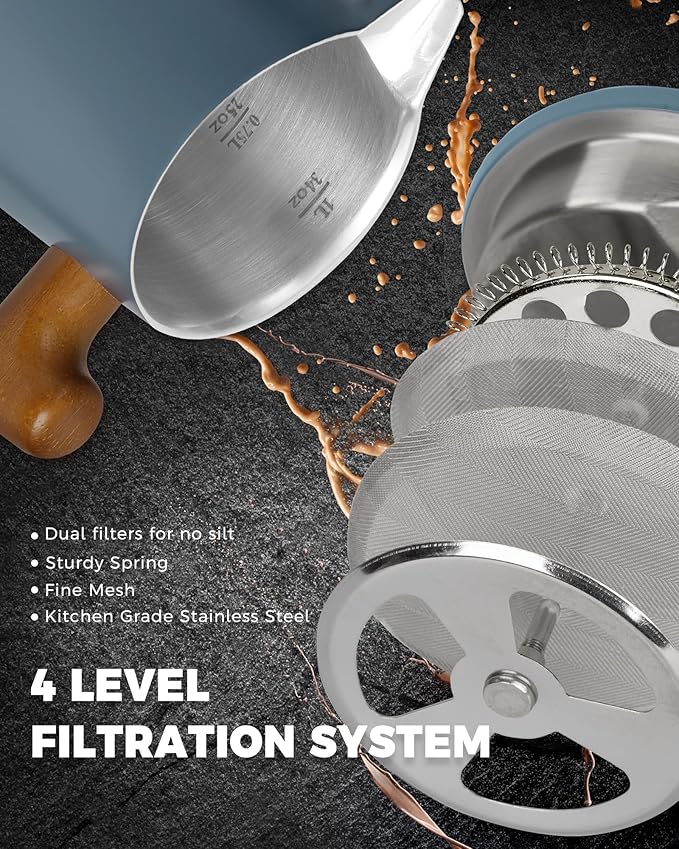 POLIVIAR French Press Coffee Maker, 34 oz Coffee Press with Real Wood Handle, Double Wall Insulation & Dual-Filter Screen, Food Grade Stainless Steel for Good Coffe and Tea, JX2025-XFPU