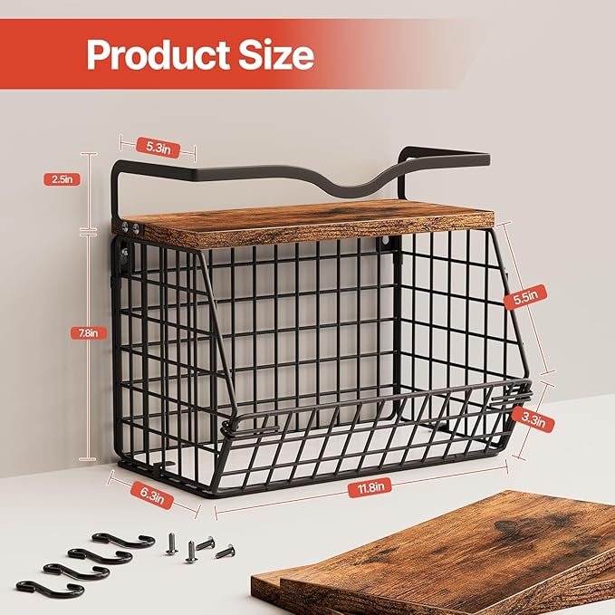 - Space-saving Design: Each set includes two black fruit baskets, measuring 11.8" in ร 6.3" in ร 8.6" in . These dimensions ensure minimal countertop space usage. The wooden lids on the top of the hanging storage baskets provide additional storage capacity while maintaining an organized appearance. The included hooks allow for hanging small items, further enhancing space-saving functionality.