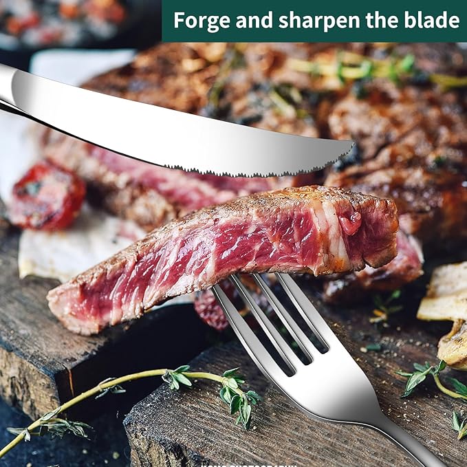 - Steak Knives Included: No need for a separate set! Our 4 precision-forged steak knives feature tightly spaced serrated edges for effortless meat cutting. Dine with confidence β the razor-sharp blades handle tough cuts smoothly, letting you focus on savoring every bite