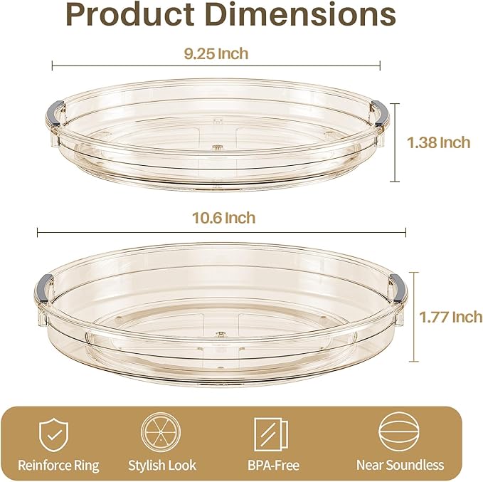 - Package Include: Our Lazy Susan pantry organizer set include 2 sizes with 10.6'' and 9.25'' turntable. You can select the perfectly size organizer for cabinets, fridge, pantry or bathroom to keep things neatly