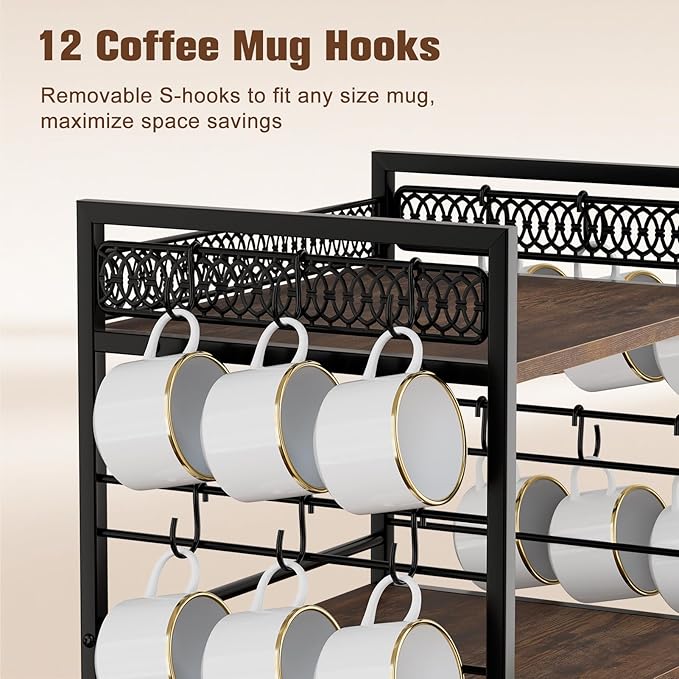 - 【12 Side Mug Storage Hooks】Our coffee pod storage organizer has 3 additional horizontal bars on each side, and provides 12 removable mug hooks to meet daily using needs. You can adjust the spacing of the mugs, according to the actual use of the coffee station countertop, making it convenient to storage coffee mugs