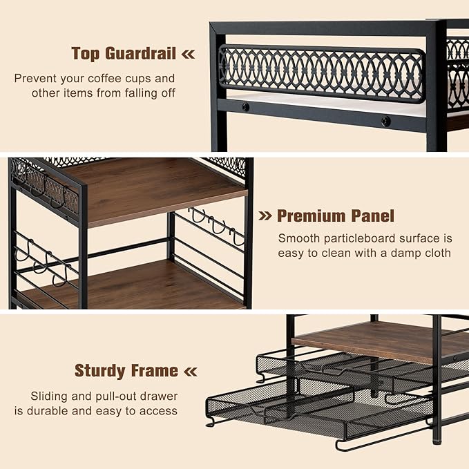 - 【4-Tier Larege capacity】The top layer of coffee stand organizer is deaigned with three sides baffletop layer to prevent items from falling effectively. The display shelf on the second tier makes it easy to place all your coffee supplies. There are two sliding drawers at the bottom, the upper drawer holds up to 30 k-cup coffee capsules, and the lower drawer can store spoons, straws, sugar packets and others