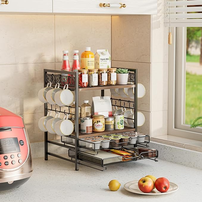 - 【Space-Saving Solution】This all-in-one coffee organizer for countertop combines combines mug holders, coffee bar organizers, and coffee pod drawer to help you maximize space, keeping everything neatly accessible. Suitable for smaller kitchens or coffee nooks, it is an great choice for limited spaces to storage coffee