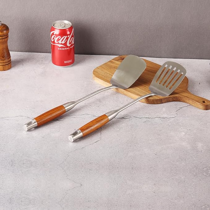 - 【15.2inch Slotted Turner & Solid Turner】: Not too heavy and not too light, ergonomic design, precise balance, silky to the touch. The unique grain of the natural rosewood handle is exceptionally beautiful, silky to the touch, provide excellent grip and high heat resistance, ensuring that the chef's hands stay cool, keep you entertained during the long hours of cooking, it can greatly enhance the cooking experience