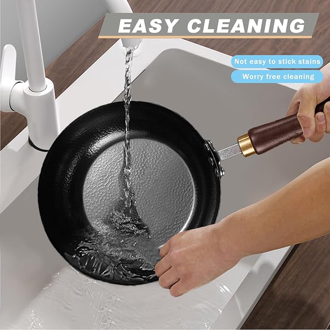 - CARBON STEEL WOK PAN: This wok pan is forged from carbon steel, renowned as the best material for woks. Once pre-seasoned, it develops a natural non-stick surface without any chemical coatings, nitriding process makes it less prone to rusting. It boasts exceptional durability, making it a reliable choice for your kitchen.