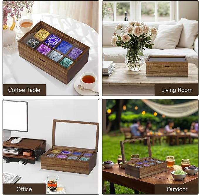- [Elegant and Practical]: The transparent acrylic lid design of this tea organizer for tea bags allows you to see all the tea bags without opening the box, so you can quickly find your favorite flavor. The thoughtful lid opening groove design, coupled with the magnetic closure, is stable and dustproof. It is both practical and beautiful, adding a touch of exquisite style to the kitchen or coffee table.