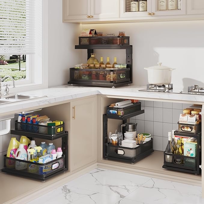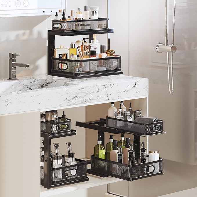 2 Pack Under Sink Organizer With Next-Gen Ball-Bearing Slides,2-Tier Precision Mesh Pull Out Cabinet Shelf Storage for Bathroom&Kitchen,Slide Out Drawers Height Adjustable,Rust-resistant
