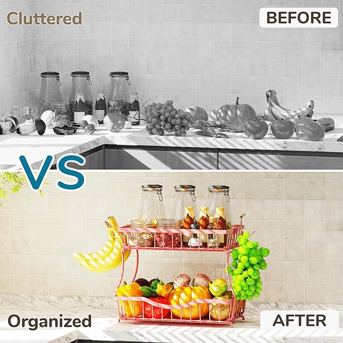 Large 2-Tier Fruit Basket for Kitchen Counter with 2 Banana Hangers – Metal Fruit Bowl for Onion, Vegetable, Snacks, Breads Storage – Countertop Organizer – Pink