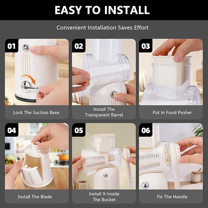 - 【Easy to Assemble】Our rotary cheese grater is quick and tool-free to set up. Simply insert your chosen drum blade into the chamber until it clicks, twist the chamber into the main body, and lock the handle into place. Finish by placing the food pusher on the loading tube. Designed for both left- and right-handed users, all parts fit seamlessly for hassle-free assembly. Whether grating cheese, slicing veggies, or shredding chocolate, you're ready to go in under a minute.