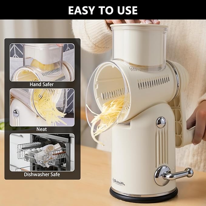 - 【Stable Suction Base for Effortless Shredding】This 5-in-1 rotary cheese grater and slicer speeds up prep by up to 18 times. Its strong suction base locks securely onto smooth surfaces, preventing slips for safe, stable use. With 5 interchangeable blades, you can slice, shred, or cut wavy textures without knife skills. Just turn the handle to prep cheese, potatoes, carrots, zucchini, chocolate, and more—quickly, safely, and mess-free. Perfect for effortless, everyday cooking.