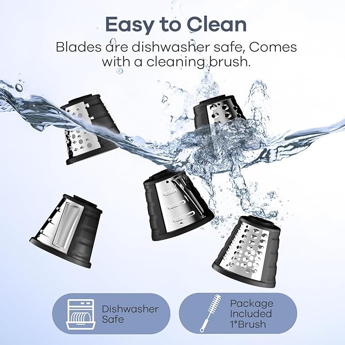 - [One-Touch Operation & Easy Cleaning]: Our cheese slicer only needs simply press the button and push the food pusher for uniform shredding - no manual cranking required. All removable parts are dishwasher-safe for hassle-free cleaning. The base only needs a quick wipe with a damp cloth (note: never submerge in water).