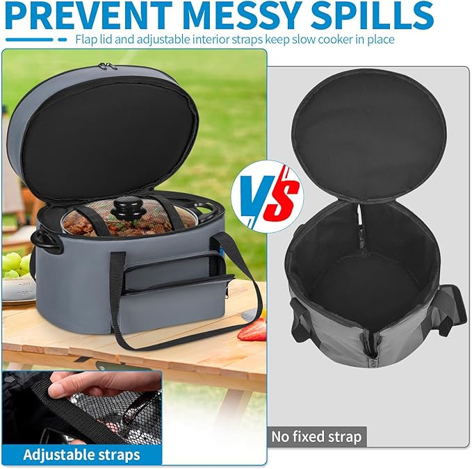 - 【Prevent Food Spills】: The inner mesh is closed with Velcro to secure Your slow cooker in place, allowing you to travel without worrying about it while on the move