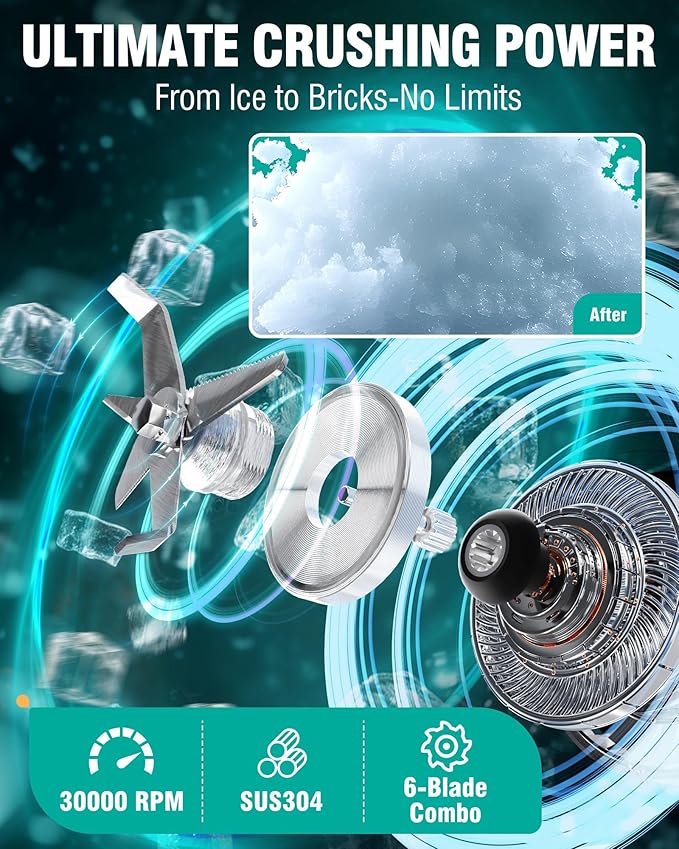 - EXTENDED 6-BLADE TECH: The upgraded 6-leaf blade system includes 2 extended flat blades, 2 serrated blades, and 2 vertical blades, ensuring 360° coverage with zero blind spots. Made of food-grade 304 stainless steel, this high speed blender pulverizes even the toughest ingredients like celery and carrots without clogging or layering, ensuring silky, lump-free results every time