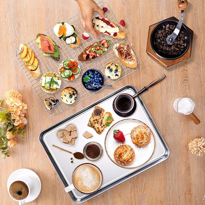 - Quality stainless steel, baking sheet with rack set is made of pure food grade stainless steel without any coating or plating, no harmful substance into your food during high heat, rust and warp resistance enables durability for long lasting