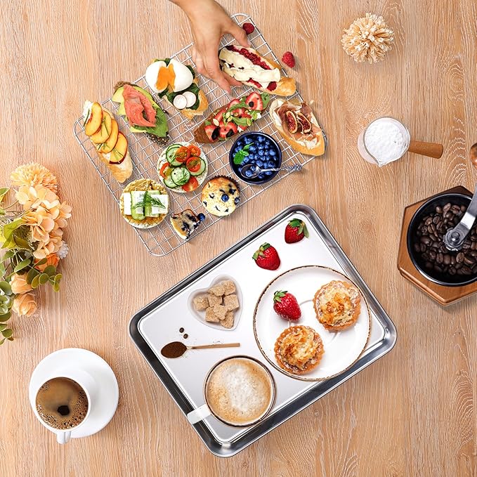 - Quality stainless steel, baking sheet with rack set is made of pure food grade stainless steel without any coating or plating, no harmful substance into your food during high heat, rust and warp resistance enables durability for long lasting