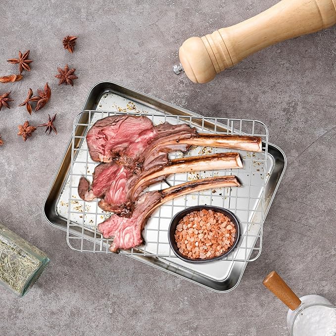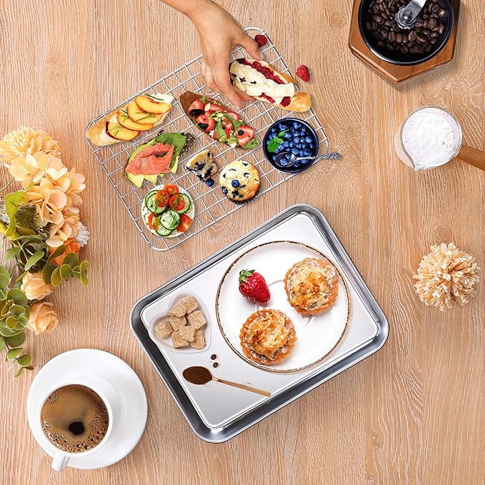 - Quality stainless steel, small baking sheet with rack set is made of pure food grade stainless steel without any coating or plating, no harmful substance into your food during high heat, rust and warp resistance enables durability for long lasting