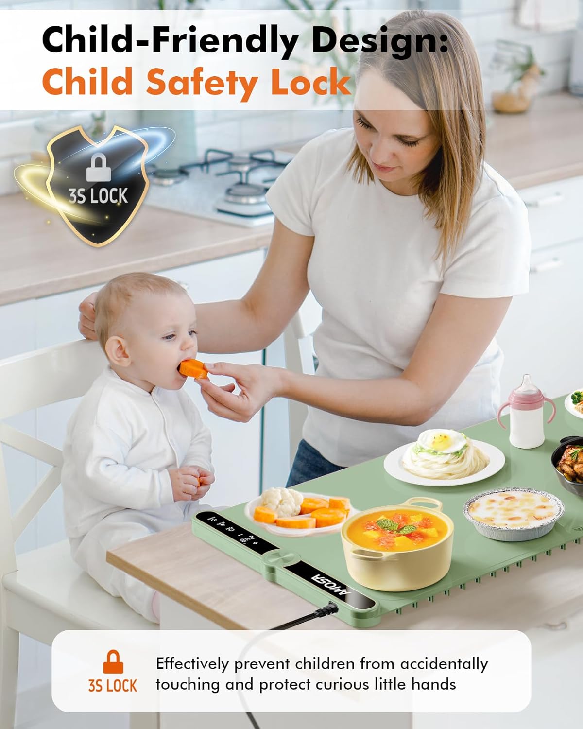 - 【Multiple Safety Protections】Different from other ordinary warming trays, our heating plate has multiple safety protection functions. It will automatically power off after working continuously for 18 hours to prevent accidents. The child protection lock design ensures the safety of your children and reduces accidental injuries caused by accidental touch. The warming pad also has a built-in Over-Temperature Protection to prevent excessive temperature and damage to personnel or machines. In addition, we thoughtfully give you an extra placemat.