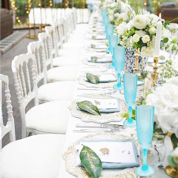 - Charming Set: Champagne flutes set include 48 retro-style light cyan blue champagne plastic wine glasses, providing ample quantity to meet your daily use and replacement needs. A suitable champagne cup is the icing on the cake. Plastic wine glasses not only carry the wine, but also carries the laughter and blessings
