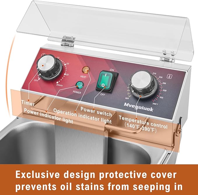 - Unique design:frier made a new upgrade in many details, the bottom upgrade 4 thick stainless steel non-slip feet to enhance stability, basket handle lengthened and thicker, the back end of the basket has hooks can be suspended draining oil, oil basin and lid have handles for easy lifting, the panel is installed with a transparent protective cover to protect the head of the machine effectively prevent pollution(shipped with the shipment and can be installed or not)