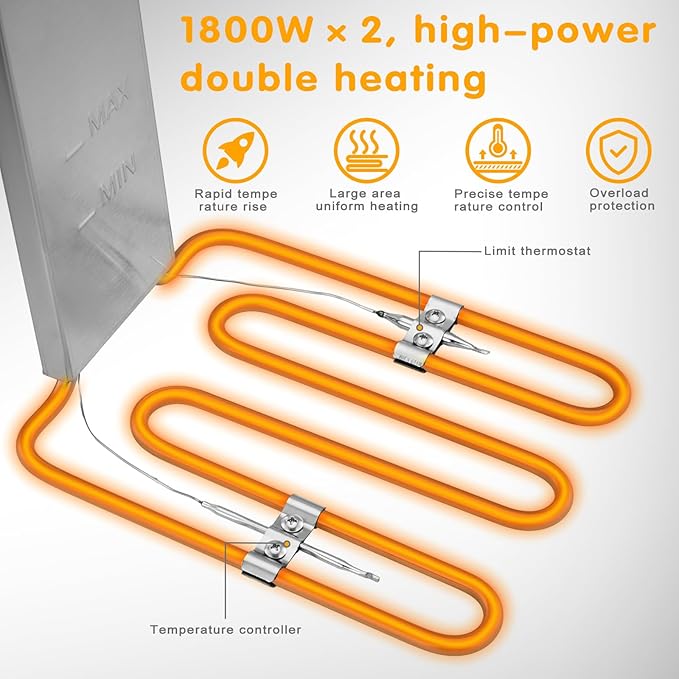 - Safe operation:deep fat fryer has a safety scale inside, please make sure that the food and oil do not exceed this scale, otherwise there will be a safety hazard, and make sure that the fryer is clean and free of water before making the food, when the oil boils, please use the lid to prevent the oil from spattering out, the fryer has 2 heating elements with a power of 1800W each, please don't plug it in the same plug when you use it!