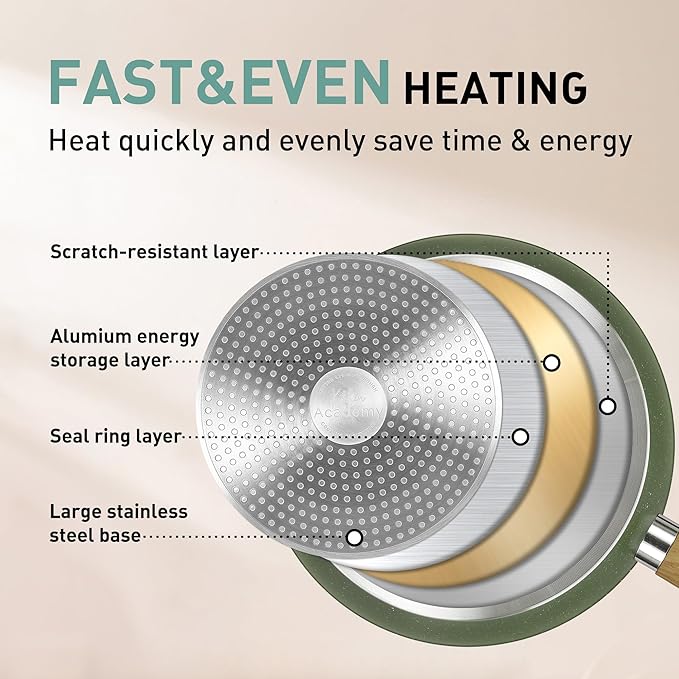 - Induction Cooktop Compatible: The cookware set is suitable for use on all stovetops, including induction cooktops. The stainless steel base provides even heat distribution and prevents hot spots