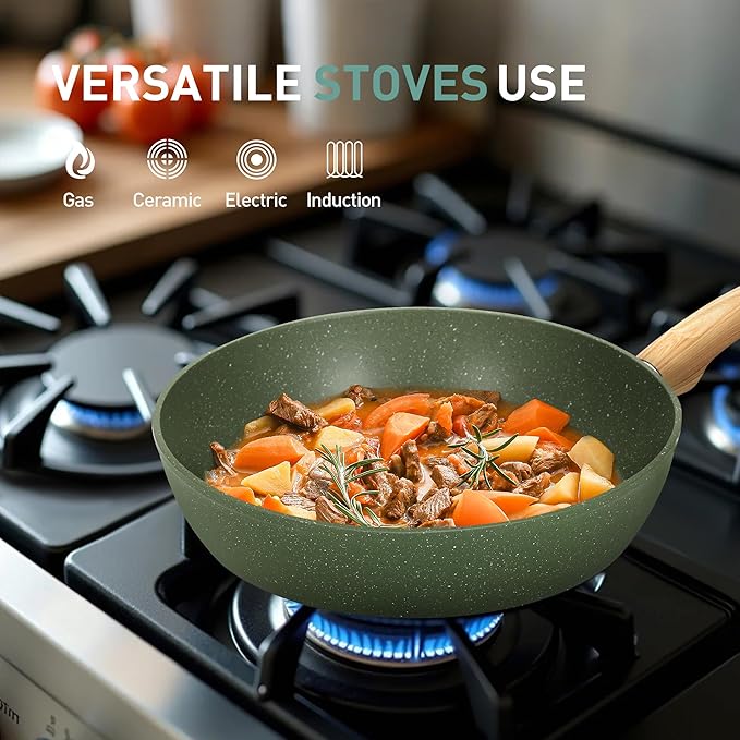 - Wooden Handles and Tempered Glass Lids: The pots and pans come with wooden handles that provide a comfortable and secure grip while cooking. The tempered glass lids allow you to monitor your food without losing heat or moisture