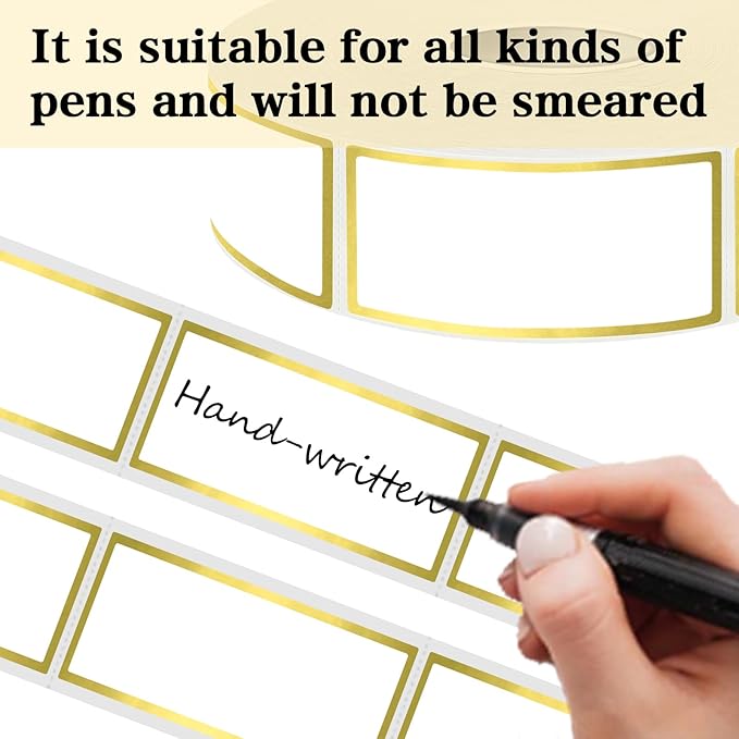 - Packaging: 600 pcs on a roll,Each measures 1” X 2”,Blank and white with gold border