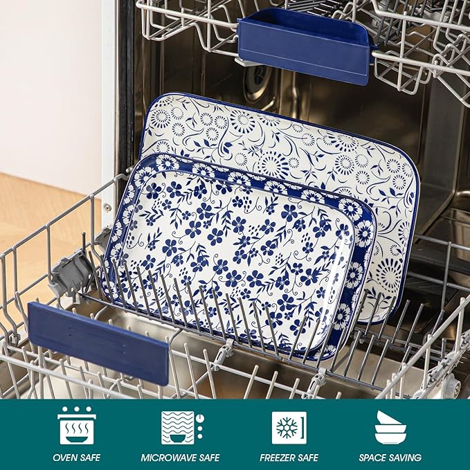 vancasso Serving Platters Set of 3, 16"/14"/12" Inch Rectangular Trays - Serving Platter Extra Large, Ceramic Serving Dish Microwave & Dishwasher Safe (Vintage Blue B)