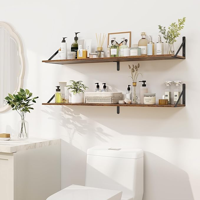 - [Large Capacity Floating Shelves] - Our wall shelves are 40" long x 8" deep, providing ample storage or display space for your kitchen, living room, bedroom, bathroom, laundry room, and more. With such a large space, you can place many items like books, collectibles, plants, crafts, photos, laundry detergent, etc. Our shelf can even be used as a bookshelf or a nightstand. Let our shelves decorate every corner of your home!