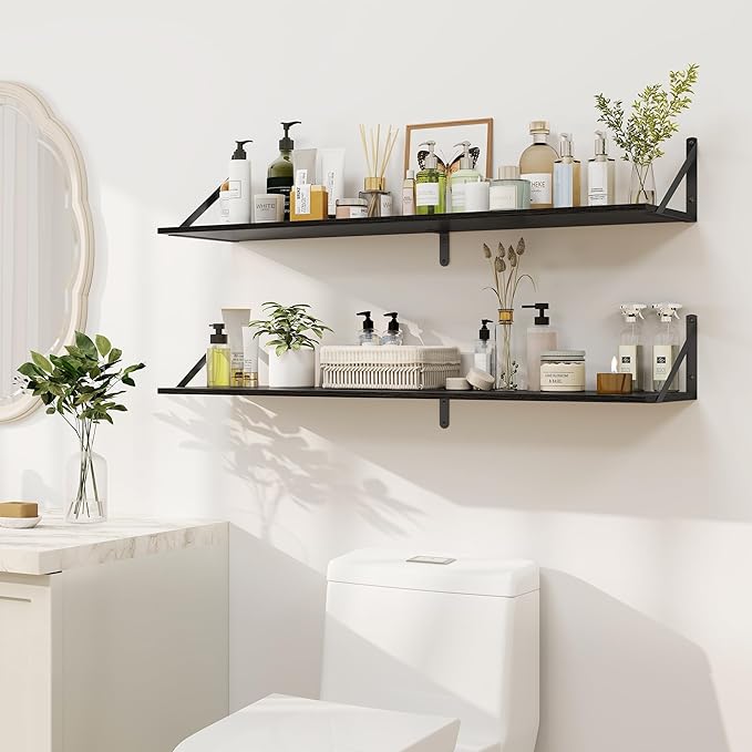 - [Large Capacity Floating Shelves] - Our wall shelves are 40" long x 8" deep, providing ample storage or display space for your kitchen, living room, bedroom, bathroom, laundry room, and more. With such a large space, you can place many items like books, collectibles, plants, crafts, photos, laundry detergent, etc. Our shelf can even be used as a bookshelf or a nightstand. Let our shelves decorate every corner of your home!