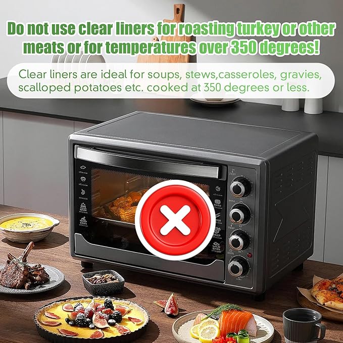 - Important Notice: Not Suitable for roasting turkey and whole cuts of meat! ! ! They are designed for use with dishes like stews and casseroles. Before use, dampen oven walls & preheat 3 mins to avoid uneven heat melting bags